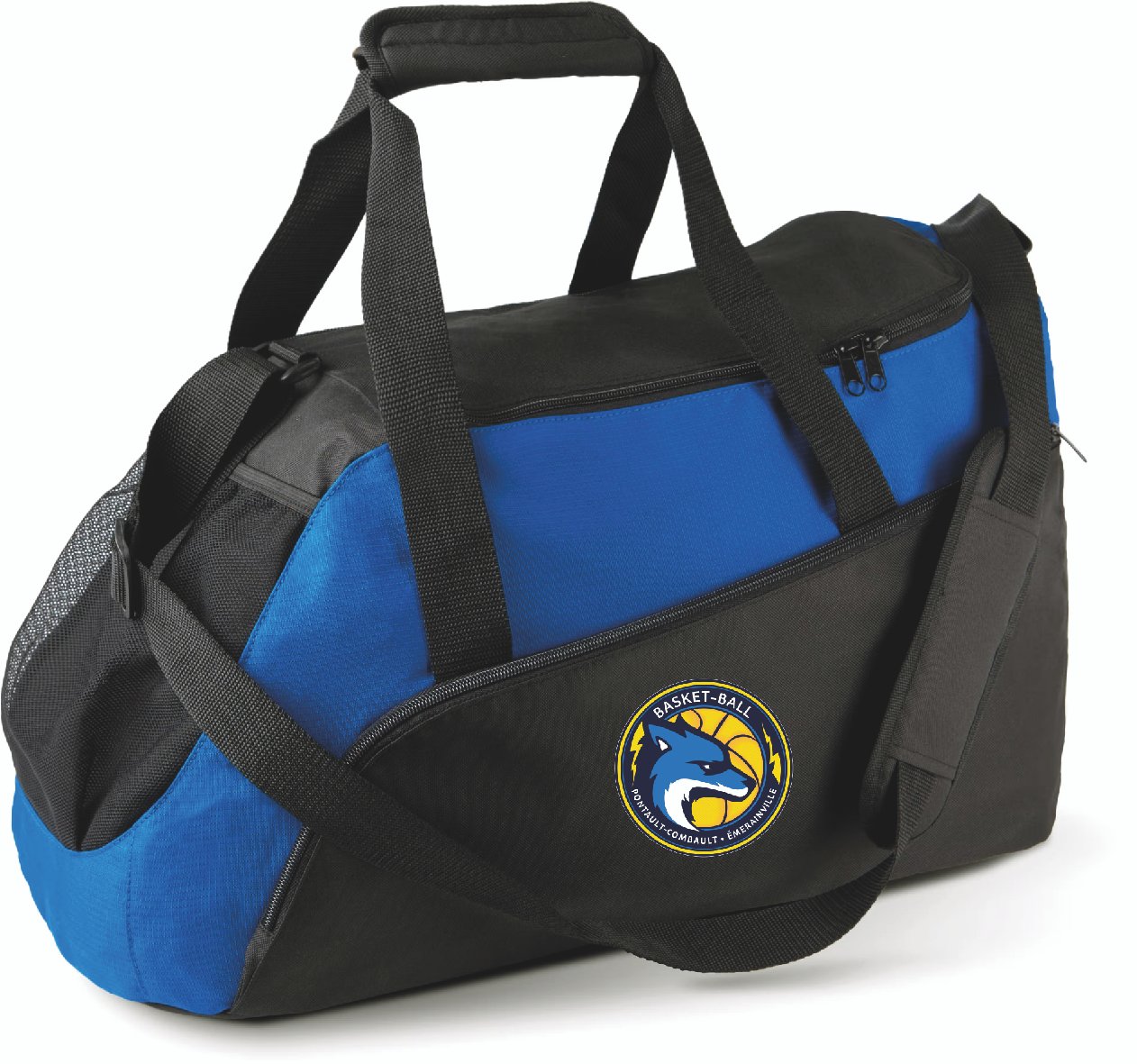 Sac de sport en polyester 600D et ripstop, 2 poignées, bandoulière ajustable, poche extérieure en filet sur le devant, grandes poches côté.